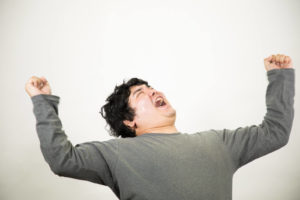 ガッツポーズしながら
